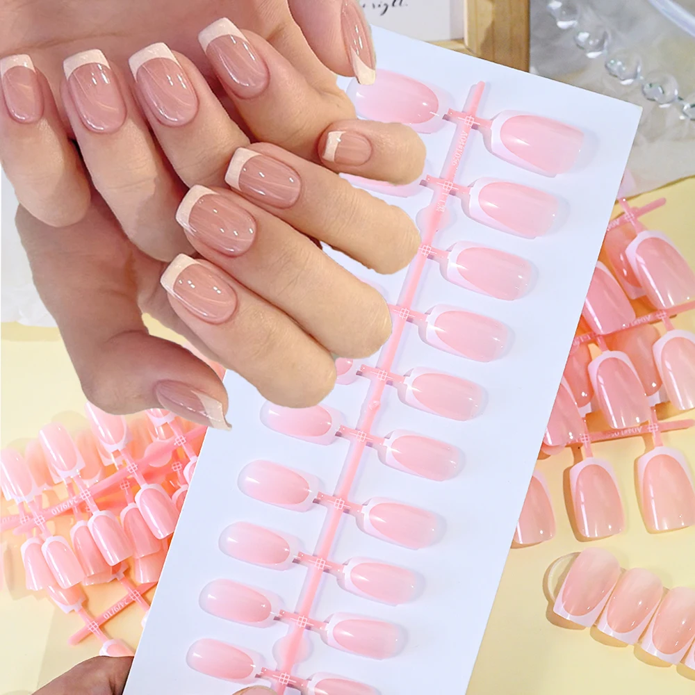 120Pcs Short Square Coffin French Fake Nails Glossy Pink Full Cover Wearable Press on Nails Wearable Acrylic Fake Nails Tips #
