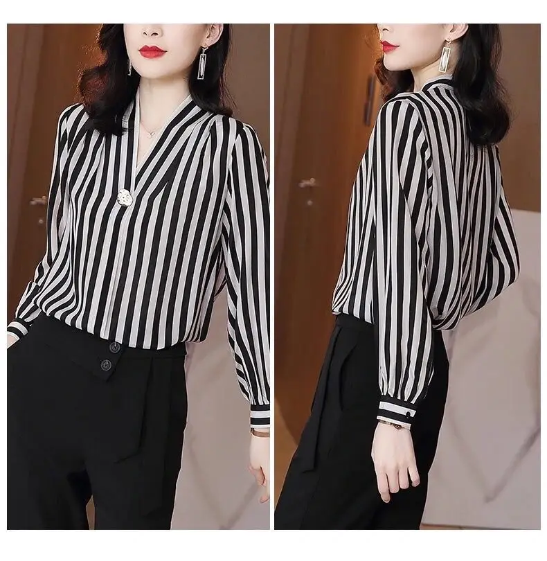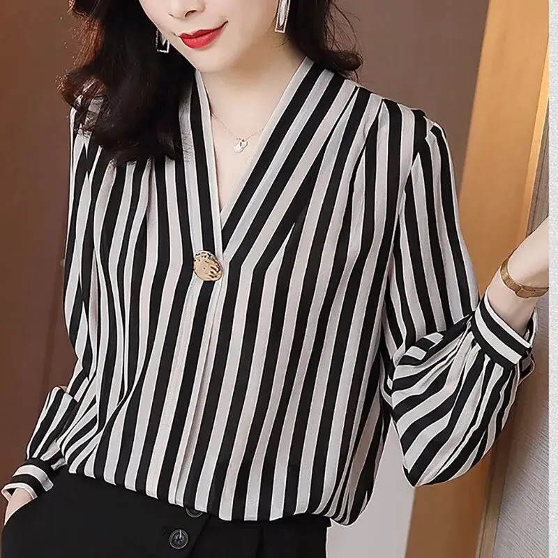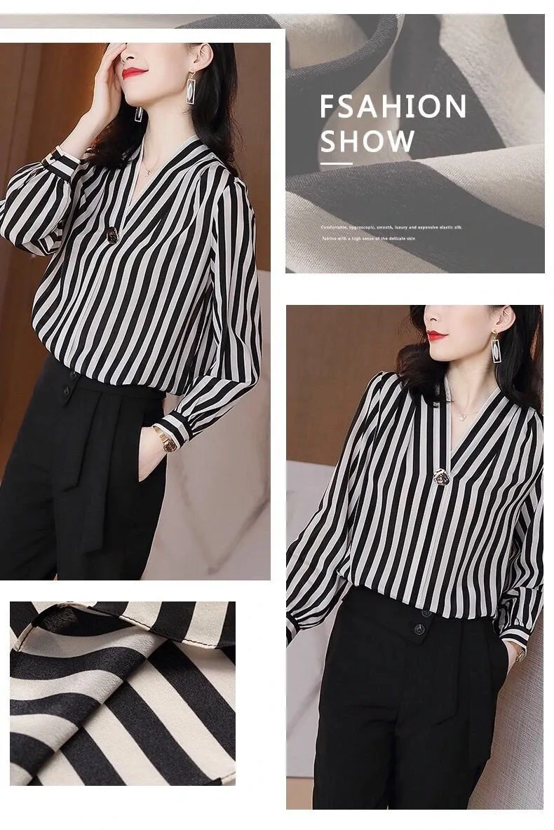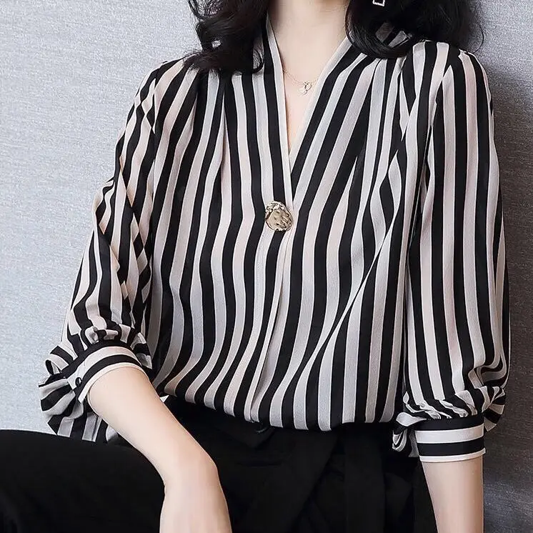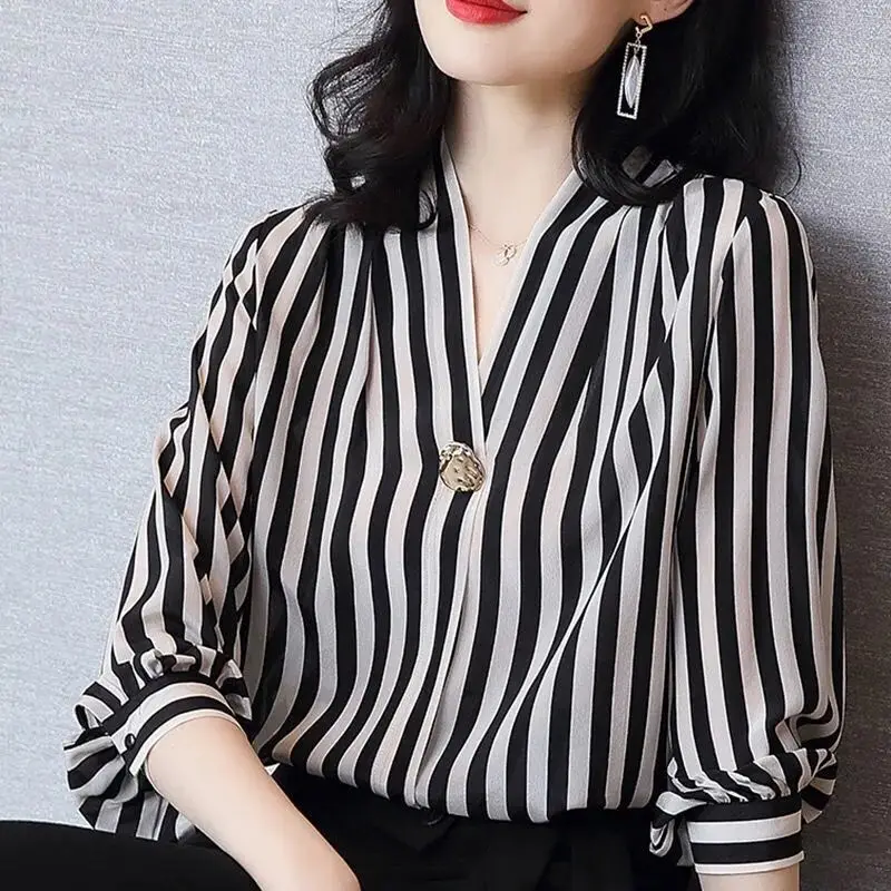 Home WOMEN FASHIONS Women Tops 2022 Stripe Office Wear Chiffon Profession Blouses Temperament Fashion Woman Urban Top with Sleeves Ladies Aesthetic Basic Shirt