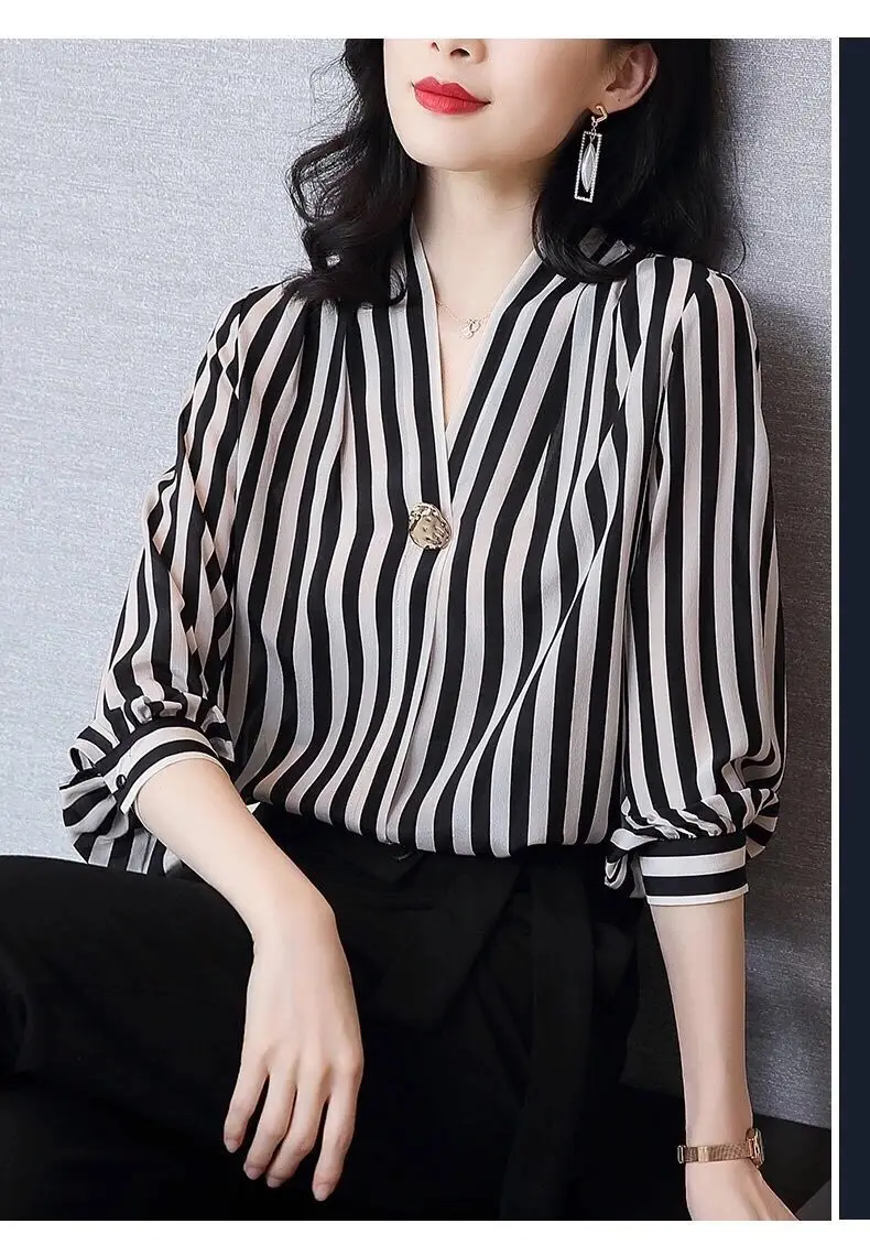 2022 Stripe Office Wear Chiffon Profession Blouses Temperament Fashion Woman Urban Top with Sleeves Ladies Aesthetic Basic Shirt 5