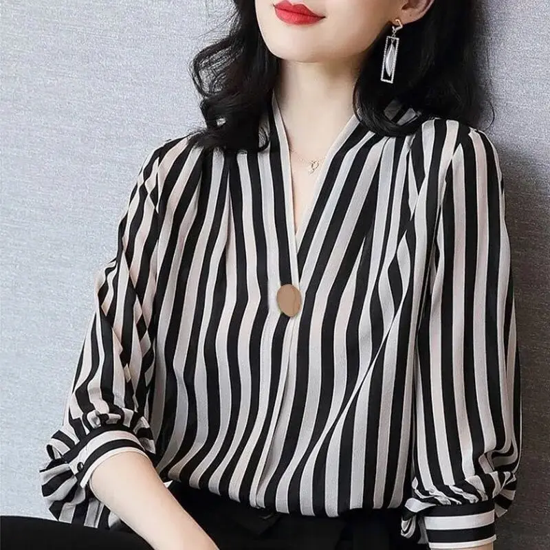 Home WOMEN FASHIONS Women Tops 2022 Stripe Office Wear Chiffon Profession Blouses Temperament Fashion Woman Urban Top with Sleeves Ladies Aesthetic Basic Shirt