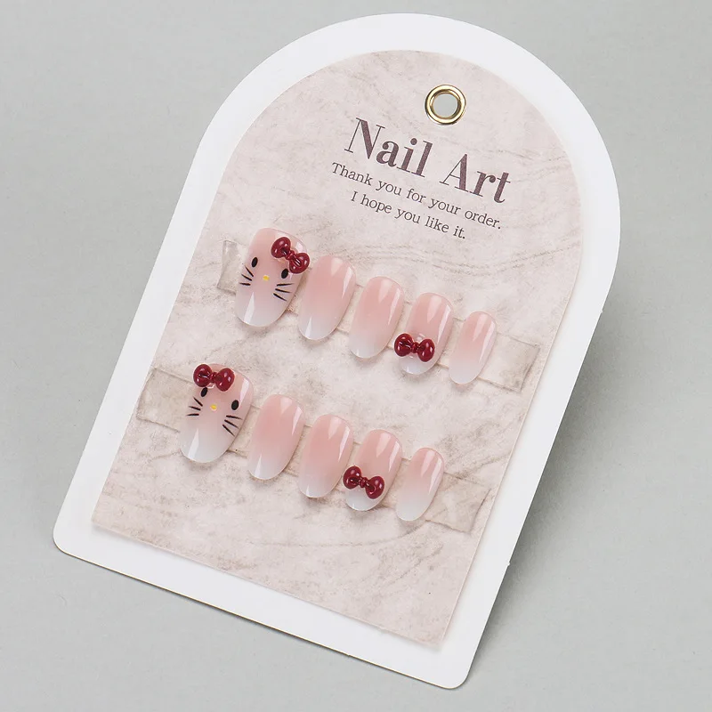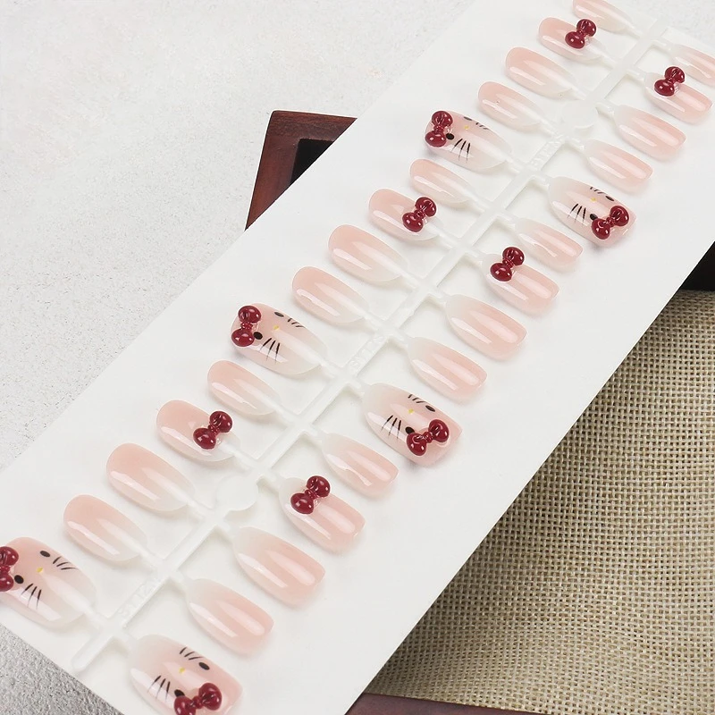 24PCS Cute Red Bowknot Short Oval Press on Nail with Glue Cartoon Cat Glossy French Fake Nails for Girls Wearable Ins Nail Tools