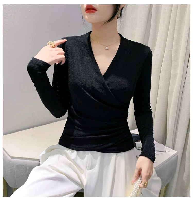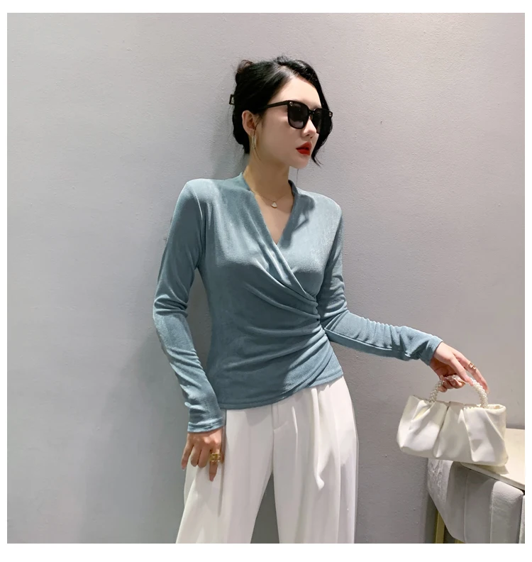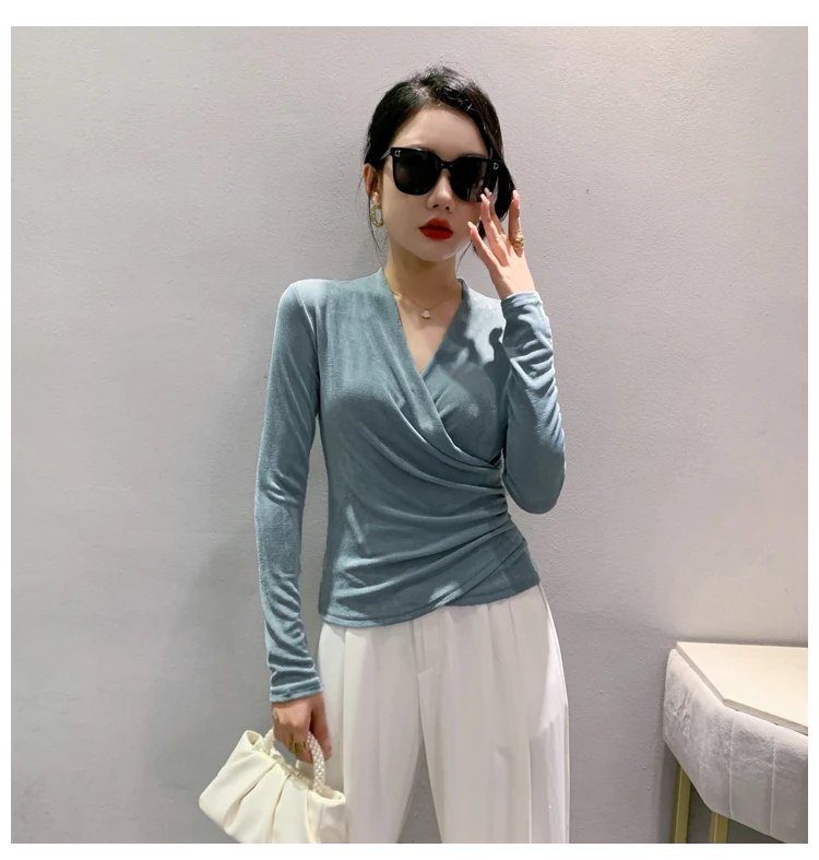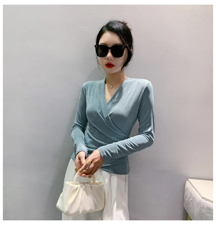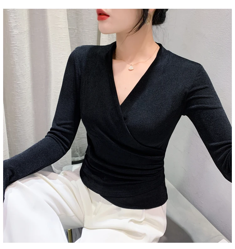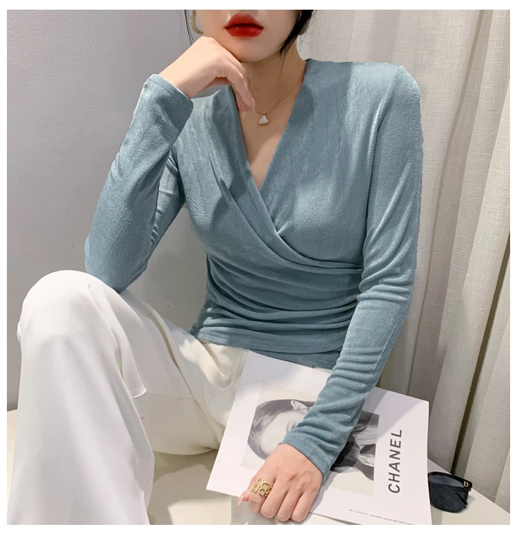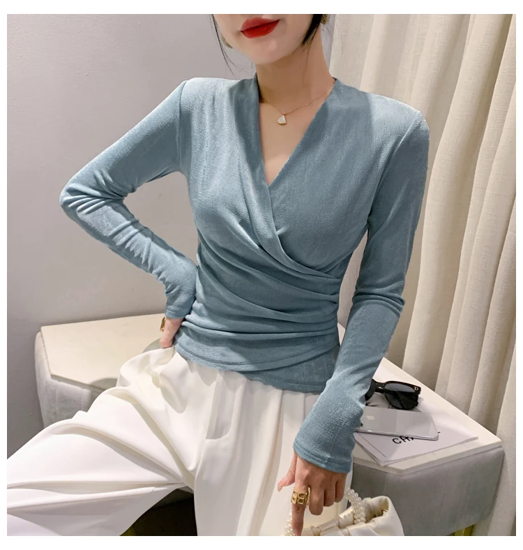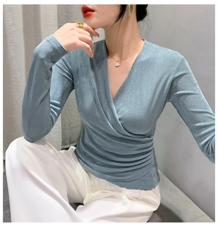Autumn Spring Crossed V Neck Folds T Shirts Lady Long Sleeve High Stretch Tops Elegant Soft Tee Shirt For Woman HF8705 6