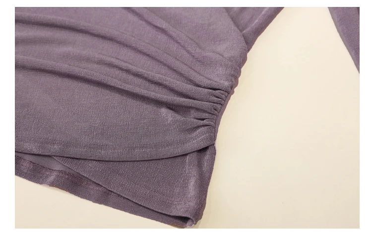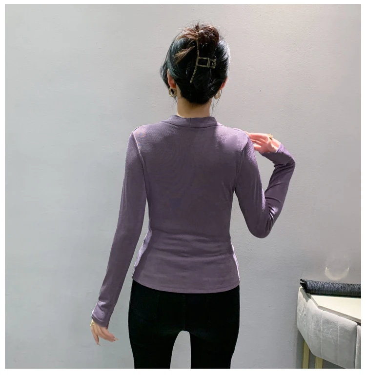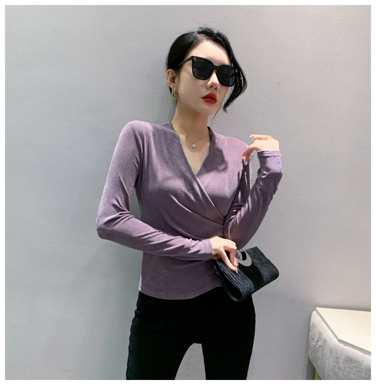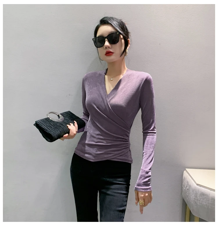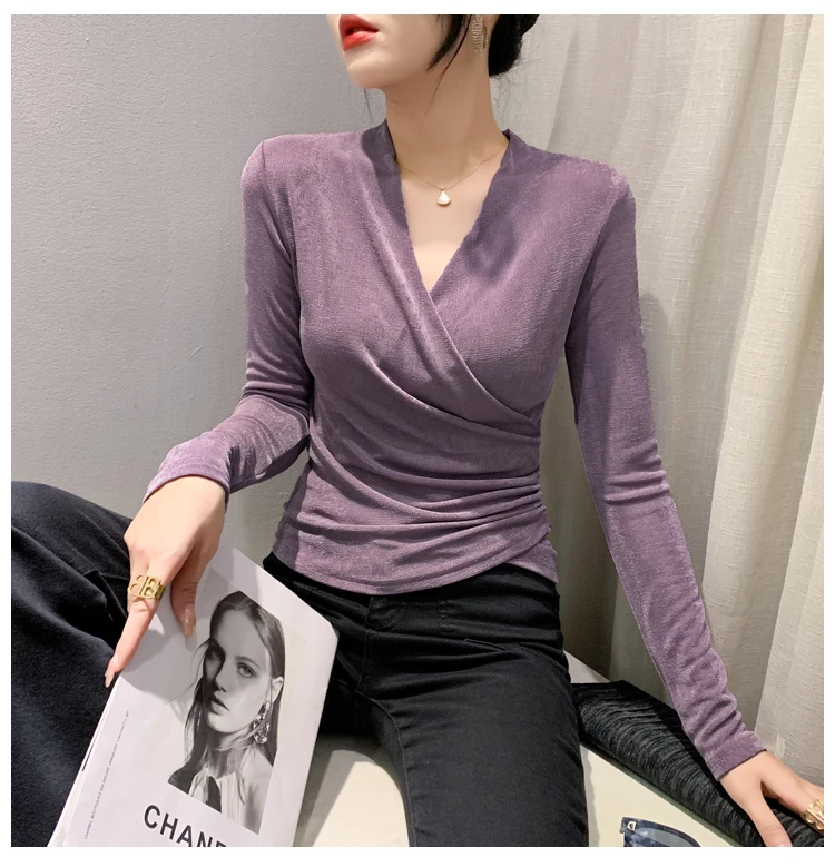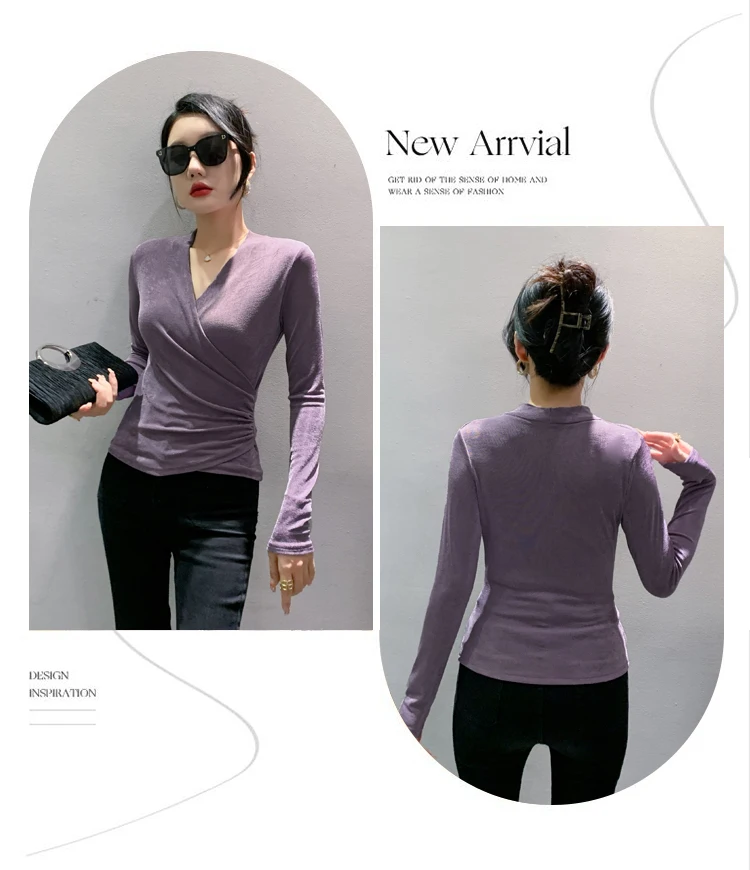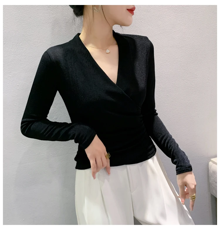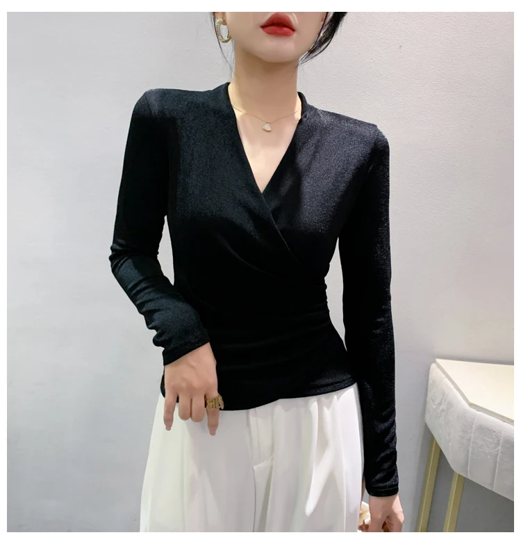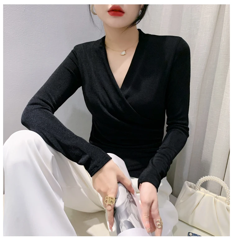 Autumn Spring Crossed V Neck Folds T Shirts Lady Long Sleeve High Stretch Tops Elegant Soft Tee Shirt For Woman HF8705 6