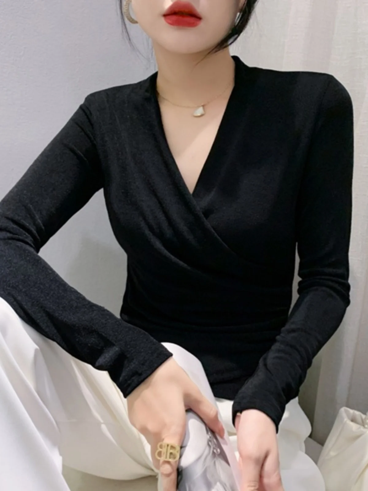 Autumn Spring Crossed V Neck Folds T Shirts Lady Long Sleeve High Stretch Tops Elegant Soft Tee Shirt For Woman HF8705