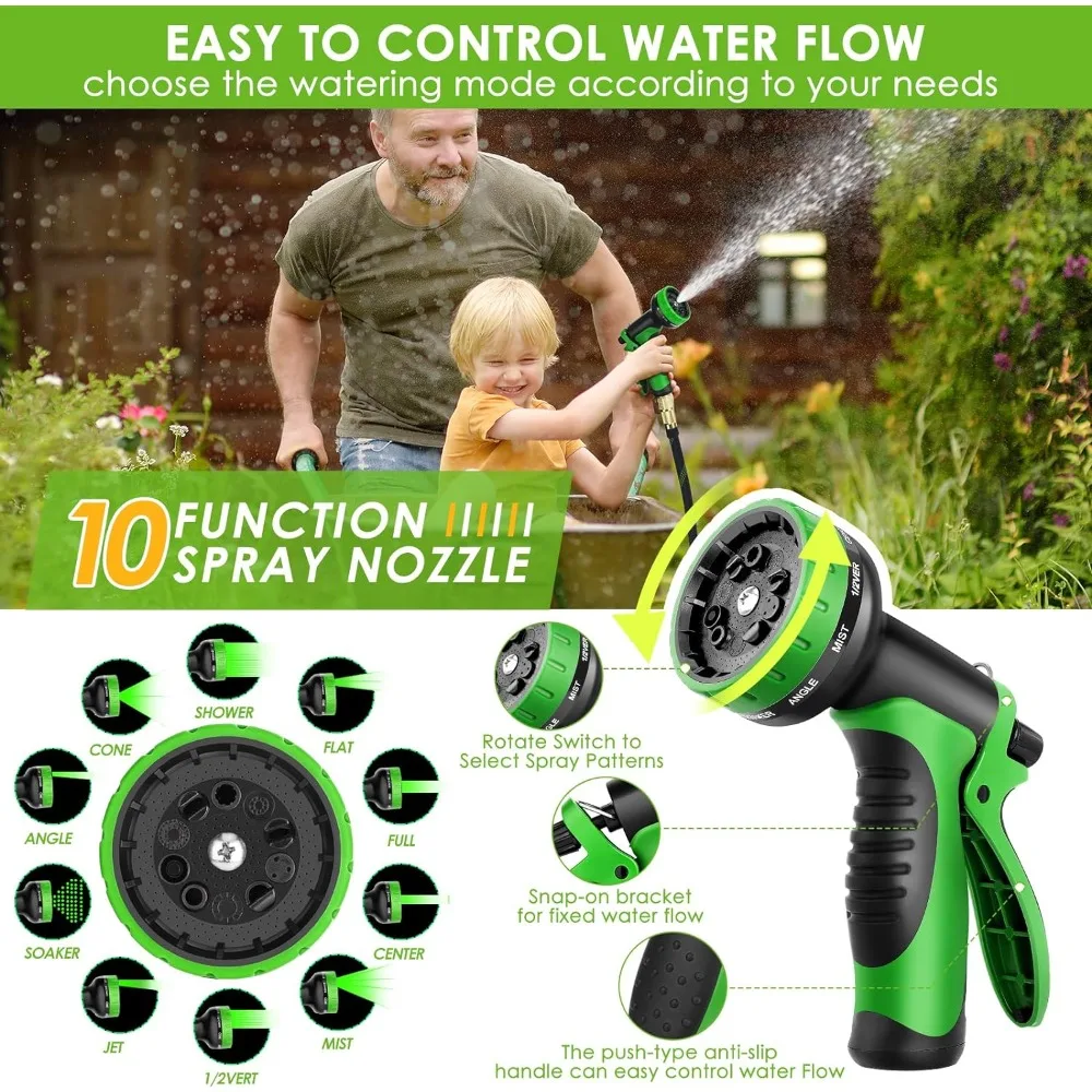 ✅【Upgraded 10 Function Spray Nozzle】: The water hose is equipped with a 10-function nozzle, featuring an ergonomically designed anti-slip textured handle and a rotating switch, allowing you to select spray modes as needed. These 10 functions include full, angle, shower, mist, center, flat, cone, jet, soak, and 1/2 VERT modes. It is suitable for various scenarios such as watering lawns, plants or seedlings, car washing, cleaning yards, carpets, bathing pets and more.