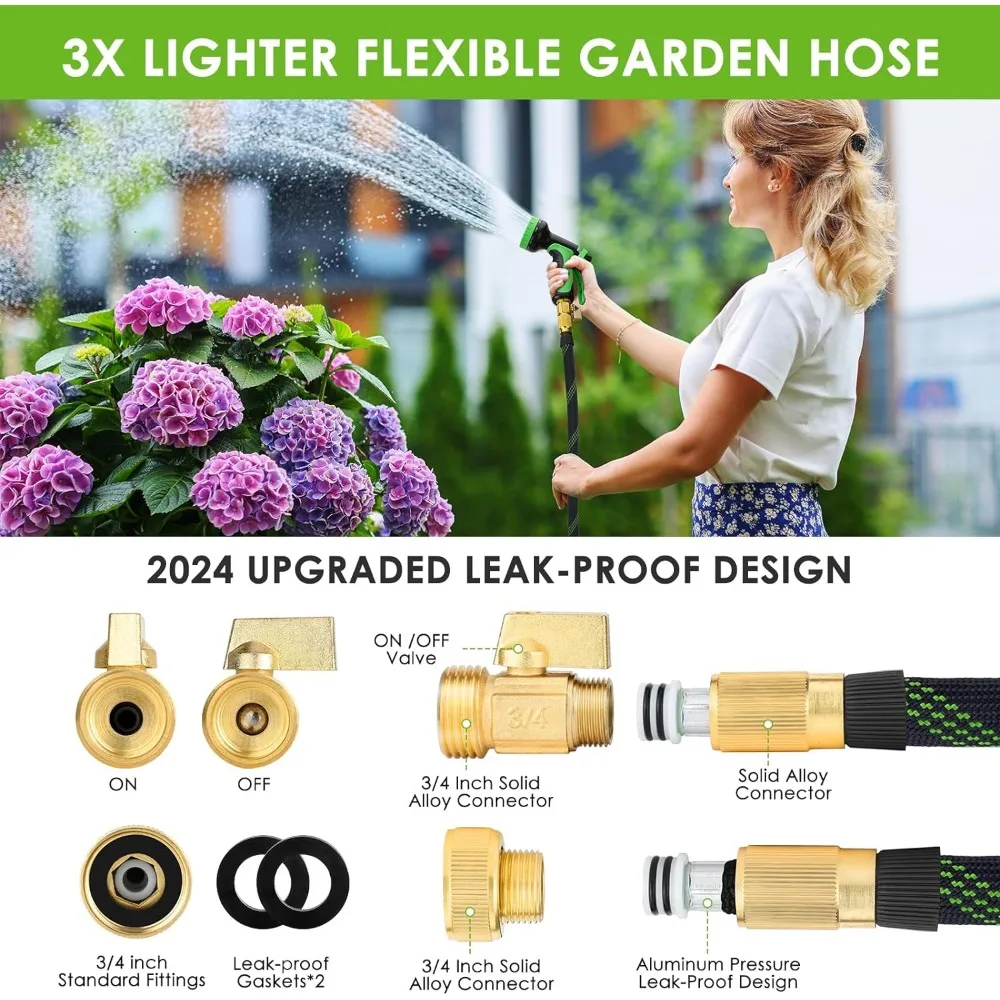 ✅【Convenient and Efficient】: Our garden hose comes equipped with standard 3/4-inch fittings and a on-off switch valve, allowing you to change nozzles or attachments without having to return to the water source. With its tangle-free design and lightweight structure, it effectively reduces pressure on your arms and back when moving or storing the hose. Its lightweight and user-friendly features truly enhance your watering experience, making gardening tasks more efficient and effortless.