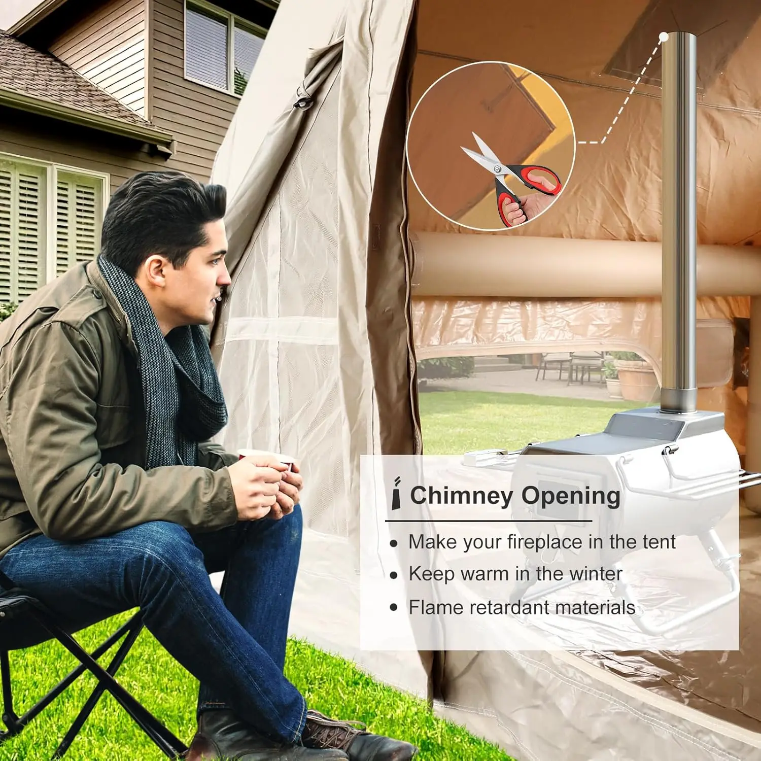 Chimney Opening: The4 season tent has a chimney aperture that enables you to make an appropriate smoke vent for your fireplace. Simply cut the cross, and you can prepare for your fireplace. When the fireplace is not in use, the chimney aperture can be closed . With this design, you can enjoy time outdoors even in the fall and winter.