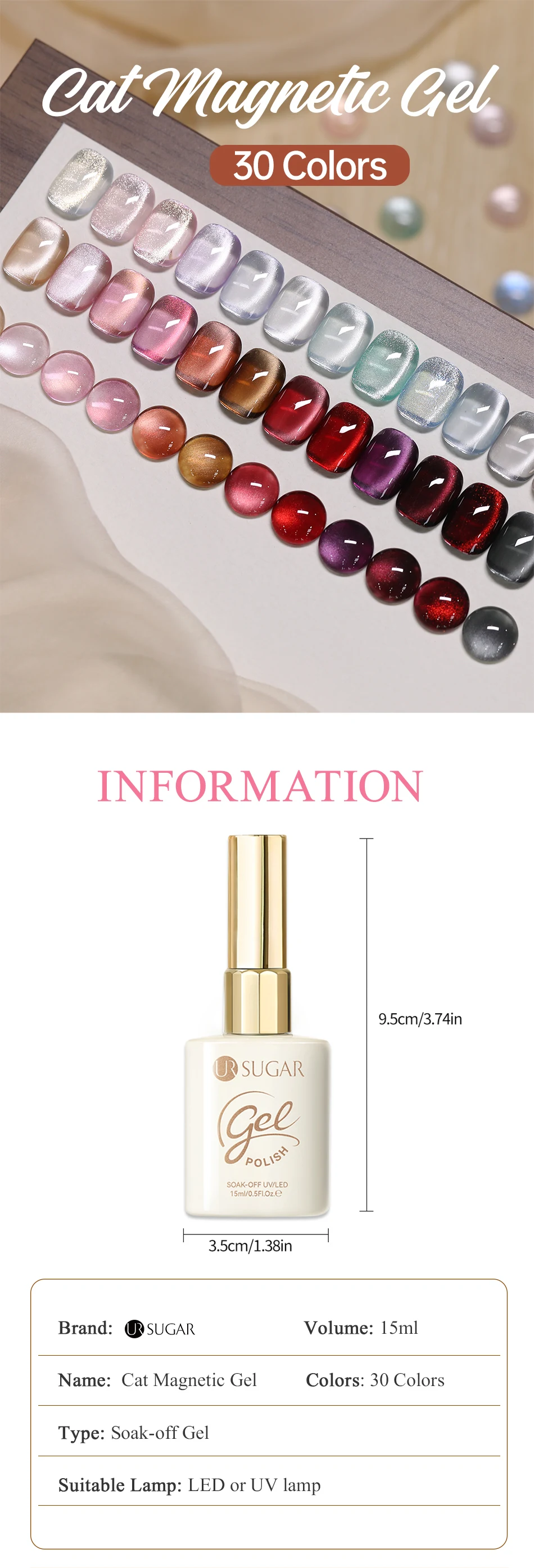 Specification:Brand:UR SUGARType:15mlColor Chart:As the pictures showQuantity:1BottleSuitable Lamp:UV Lamp or LED LampPackage Contents:UR SUGAR 15mlWhy Choose Our Nail Polish?It is quick-drying with any UV Light.This nail gel polish is easy to apply and soak off.Allow you for professional or home nail art design.A professional nail art gift for yourself or your girlfriend.How To Use Our Nail Polish?1. Apply Base Gel and cure.2.Apply Cat Magnetic Gel and not cure.3.Place the magnetic stick over the nail to get the desired shape and cure it.4. Apply top coat and cure.How to Remove Our UV Gel Nail Polish?1. Remove the top coat with a file.2. Soak off the nails into gel polish remover wraps pads for 5-10mins.3. Use a cuticle pusher to remove softened gel.4. Apply nail cuticle oil and massage it gently.Gentle Tips:1. Avoid all skin contact. If redness or other signs of adverse reaction occur, discontinue use immediately.2. Keep tightly sealed. Keep out of sunlight. Keep out of reach of children.